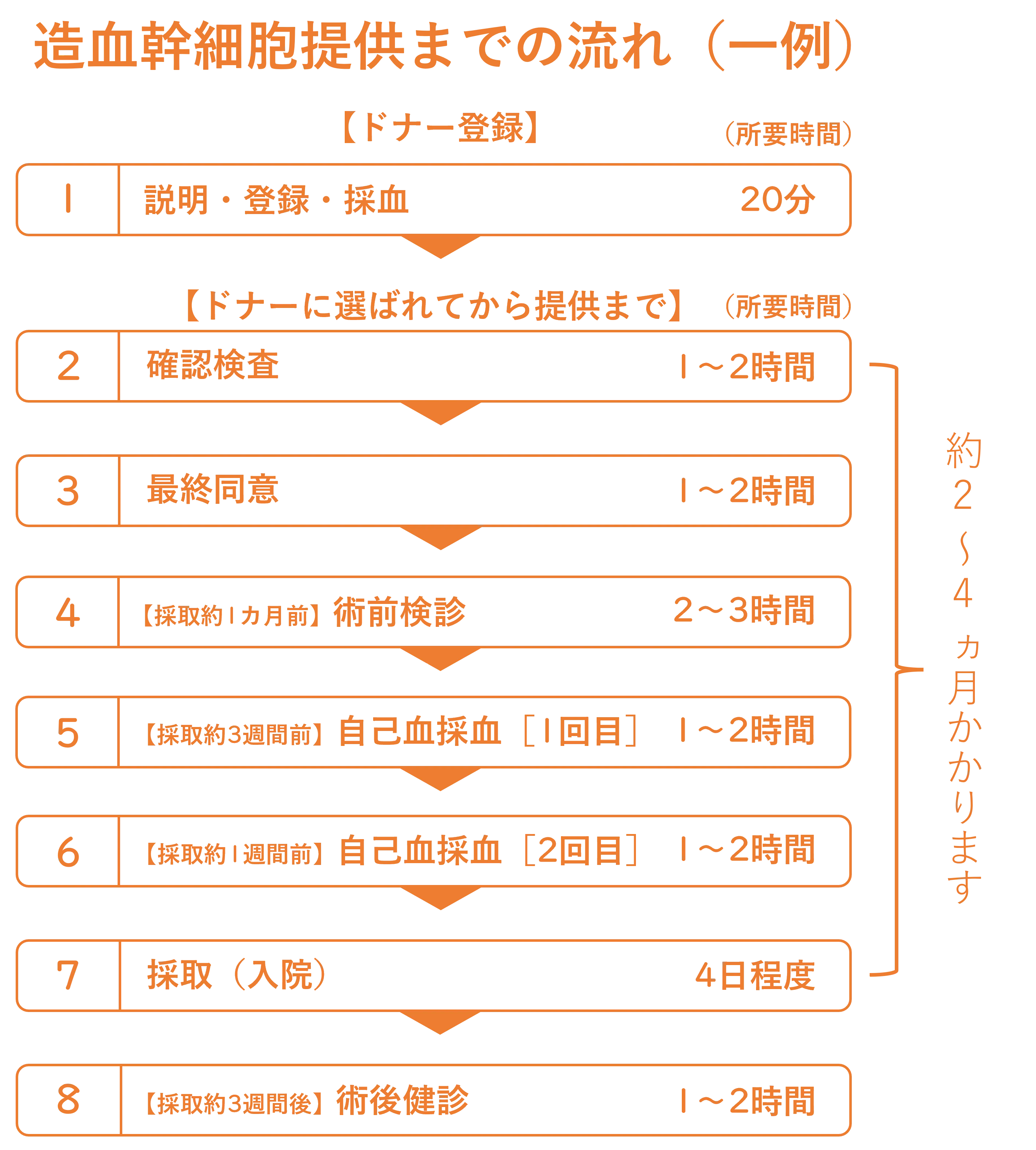 骨髄バンクを介して骨髄・末梢血幹細胞提供をする場合、説明や検査のため、平日の日中に医療機関へ出向いていただく必要があります。その回数は多い場合で8回前後にもなり、提供時の入院や採取後の健康診断を含めると、お仕事を休む日数が10日以上に及ぶことも珍しくありません。